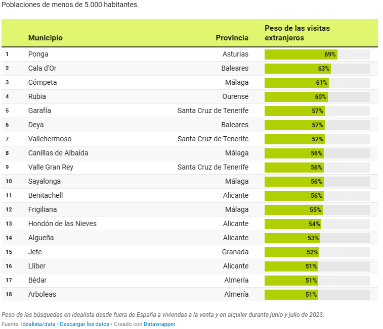 D’autre part, il y a un total de 18 villes en Espagne où la majorité des recherches de logement proviennent de l’étranger, au-delà de l’intérêt des nationaux. La plus grande différence d’intérêt se trouve dans la municipalité asturienne de Ponga, où 69% des visites d’annonces de logement proviennent de l’étranger. Elle est suivie par Cala d’Or (Îles Baléares) avec 63%, Cómpeta (Malaga) avec 61% et Rubia (Ourense) avec 60%.