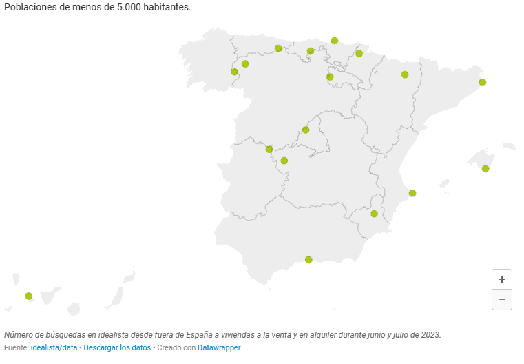 À Frigiliana (Málaga), le poids des étrangers est de 55%, tandis que Hondón de las Nieves (Alicante) atteint 54%, suivi d’Algueña (Alicante) avec 53% et de Jete (Grenade) avec 52%. Llíber (Alicante), Bédar et Arboleas (toutes deux à Almería) ferment la marche des villes où les étrangers effectuent plus de recherches que les nationaux, avec 51% du total.