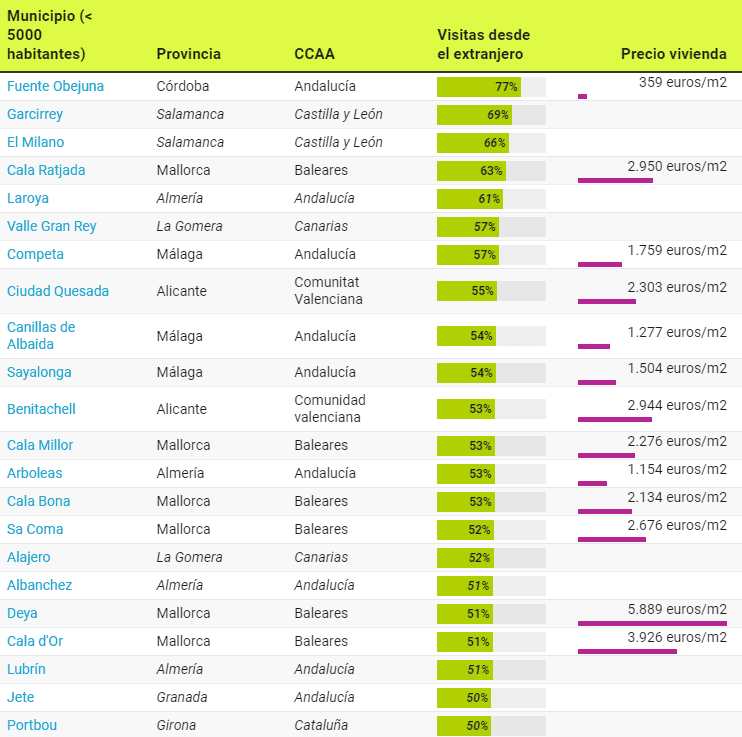 Sa Coma (Majorque) et la ville de Gomeran d’Alajero (Santa Cruz de Tenerife) ont représenté 52 % des recherches, tandis que Albanchez (Almeria), Deya (Majorque), Cala D’Or (Majorque) et Lubrín (Almeria) en ont représenté 51 %. Enfin, les villes de Jete (Grenade) et Portbou (Gérone) présentent un intérêt égal pour les étrangers et les nationaux.