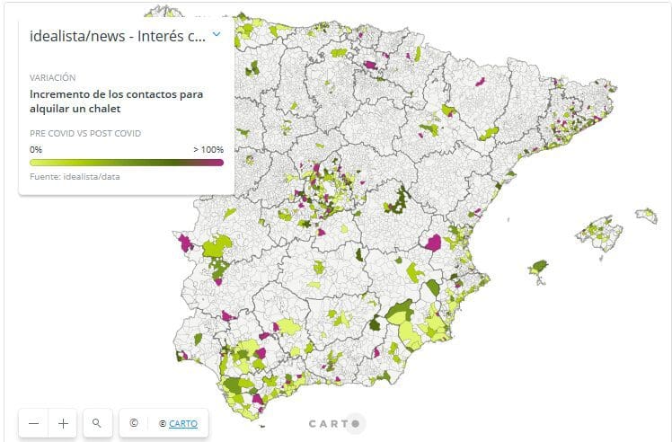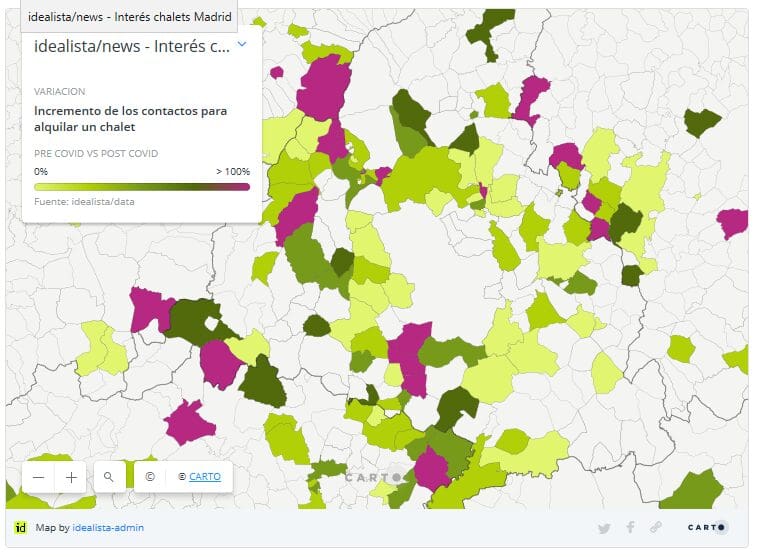 Dans la ville de Madrid, l’intérêt pour la location d’une villa de est en dessous de 4 % pendant la période de confinement, alors que dans d’autres zones de montagne de la Communauté de Madrid, comme El Escorial ou Guadarrama, les contacts ont doublé ces derniers mois. Outre l’idée de vivre dans une maison individuelle à la montagne, l’intérêt pour ce type de logement s’est également multiplié dans d’autres municipalités de la ceinture sud de Madrid comme Fuenlabrada, Leganés ou Parla.