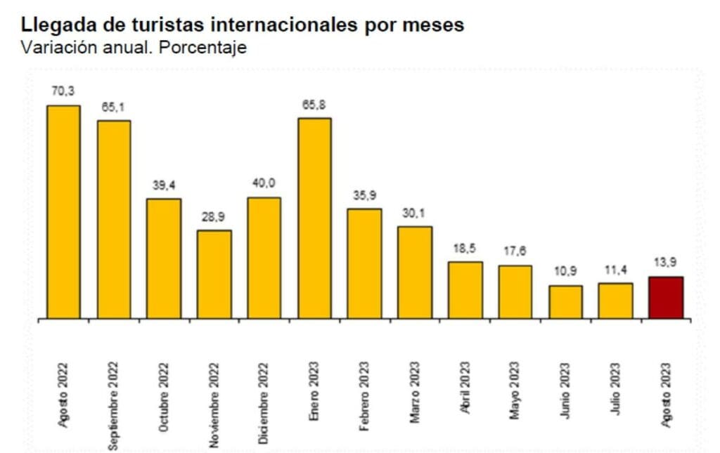 Pour le seul mois d’août, 10,1 millions de touristes internationaux nous ont rendu visite, soit 13,9% de plus qu’au même mois de 2022. Ce chiffre est inférieur de 0,4% à celui du même mois en 2019.
