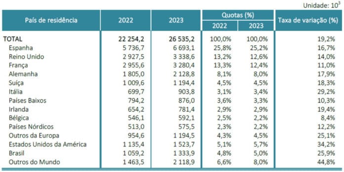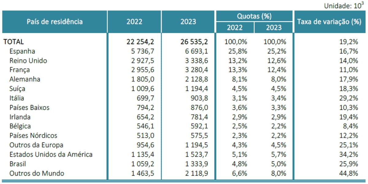 Après l’Espagne, qui a atteint une part de plus de 25%, le Royaume-Uni a de nouveau été le deuxième marché envoyant le plus de voyageurs au Portugal, avec une part de 12,6%, en hausse de 14%. Les Français, qui étaient la deuxième source la plus importante en 2022, sont arrivés en 3ème position, avec 12,4% du total et une croissance de 11%.