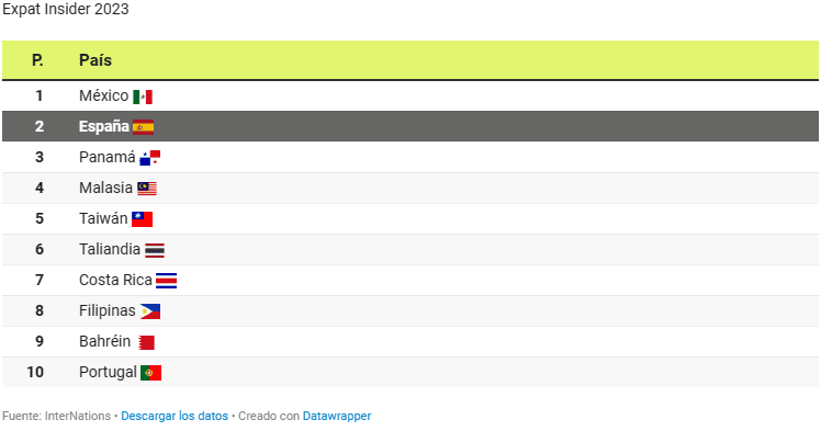 Cette année encore, les travailleurs expatriés votent pour les meilleurs et les pires pays où ils vivent. L’Espagne (2) figure à nouveau parmi les options préférées de ces travailleurs expatriés, selon le dernier classement publié par InterNations, juste derrière le Mexique. Des pays comme le Panama, la Malaisie, le Costa Rica et le Portugal figurent dans le top 10 de ce classement.