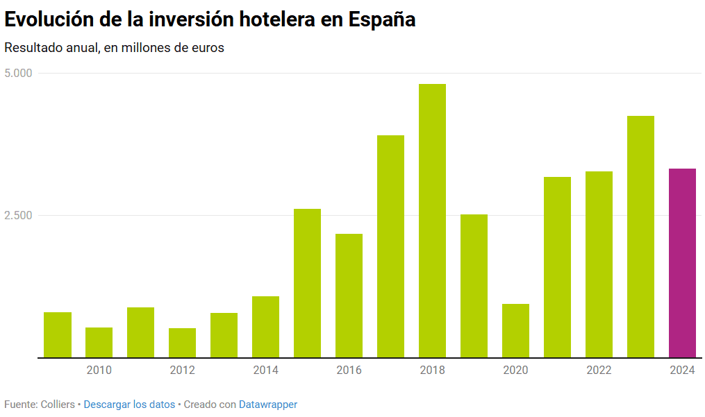 L’investissement hôtelier en Espagne a enregistré 3,3 milliards d’euros en 2024, soit 22,31% de moins par rapport à l’année précédente, selon les données de la société de conseil Colliers.