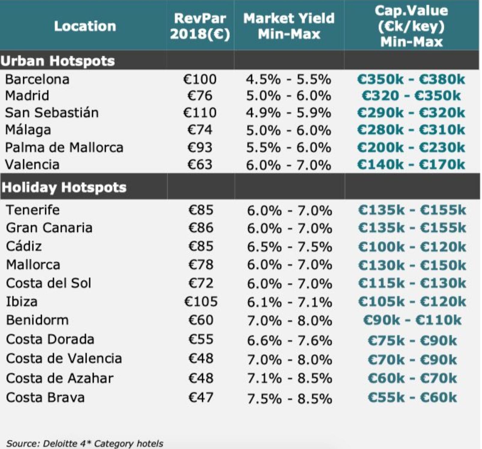 L‘étude «Indicateurs clés de l’investissement hôtelier 2018» de Deloitte, présentée ce jeudi à Valence, montre le bon état du marché des investisseurs hôteliers en Espagne et met en évidence la rentabilité offerte par des villes comme Valence, Séville, Bilbao ou Majorque, qui présentent un RevPAR suite compétitifs que d’autres avec des prix par chambre plus élevés, tels que Madrid, Barcelone ou Saint-Sébastien.(Hostetur)