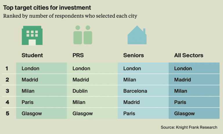 Cette analyse, basée sur une enquête auprès de 51 investisseurs institutionnels et family Offices avec une allocation totale de 67 milliards d’euros en actifs résidentiels à travers l’Europe, place Madrid derrière Londres en termes d’attractivité pour les investissements dans PRS et PBSA.