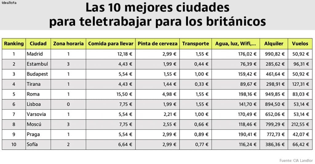 L’assureur britannique CIA Landlord a publié un rapport analysant les meilleures villes pour le télétravail pour les Britanniques et Madrid est en tête du classement, en raison des vols bon marché, du faible coût de la vie et de la forte activité culturelle dans la capitale espagnole. Ces facteurs compensent le loyer relativement élevé d’un logement, selon la firme.