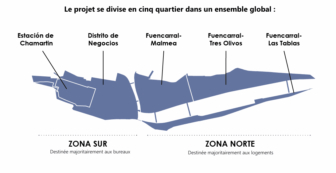 Le projet se divise en cinq quartiers (Estación de Chamartín, Centro de Negocio, Fuencarral Malmea, Fuencarral Tres Olivos et Tablas) et deux grandes zones. La première au sud de la M30, destinée aux bureaux et au quartier d’affaires, la seconde, au nord, sera un futur quartier de logements. Ces plans qui réduisent de 20 % le projet initial, puisque désormais il s’étend sur 2,678 millions de mètres carrés. Madrid Nuevo Norte devrait ainsi compter plus de 11 000 foyers (19 000 dans le plan précédent), dont 20 % destinés à un usage public.
