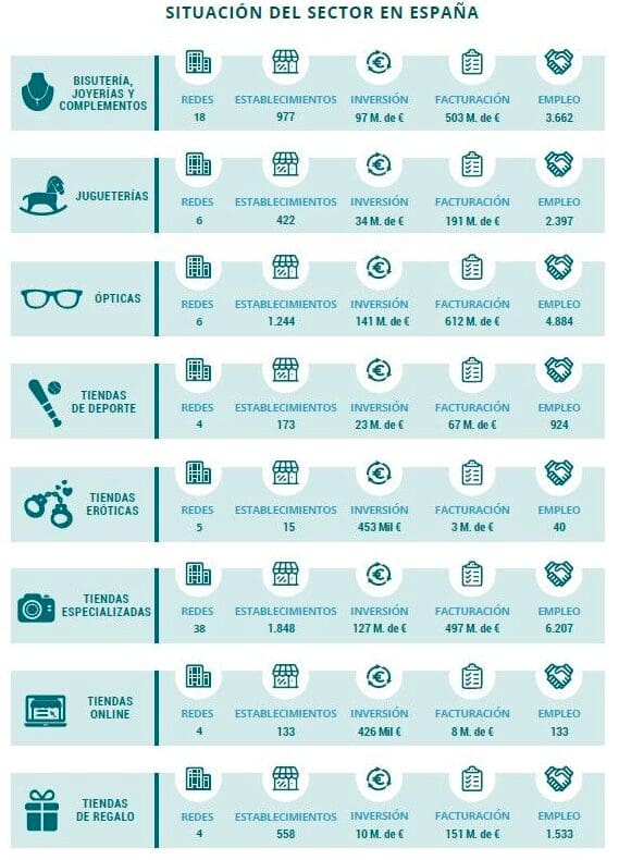 Les magasins spécialisés sont compris comme ceux identifiés dans les huit principaux segments; franchises sportives, jouets, optiques, érotiques, cadeaux originaux, bijoux, spécialisés et en ligne. L’investissement total atteint dans le secteur dépasse 432,9 milliards d’euros, dont 141 millions pour l’optique.