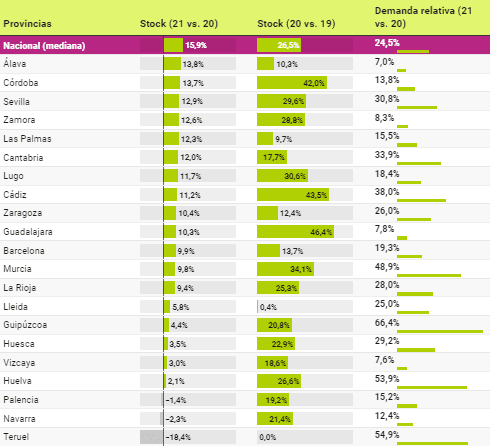 Du côté de la demande relative, c’est-à-dire la pression de la demande sur l’offre de biens ruraux annoncés sur idealista, on constate que l’augmentation du stock s’est accompagnée d’une augmentation de l’intérêt des utilisateurs pour ce type de biens. La plus forte hausse de la demande relative a été observée en 2020, avec une augmentation de près de 75 %, alors qu’au cours de l’année dernière, elle s’est modérée à 25 % au niveau national. Entre 2019 et 2021, la pression de la demande a doublé en moyenne.