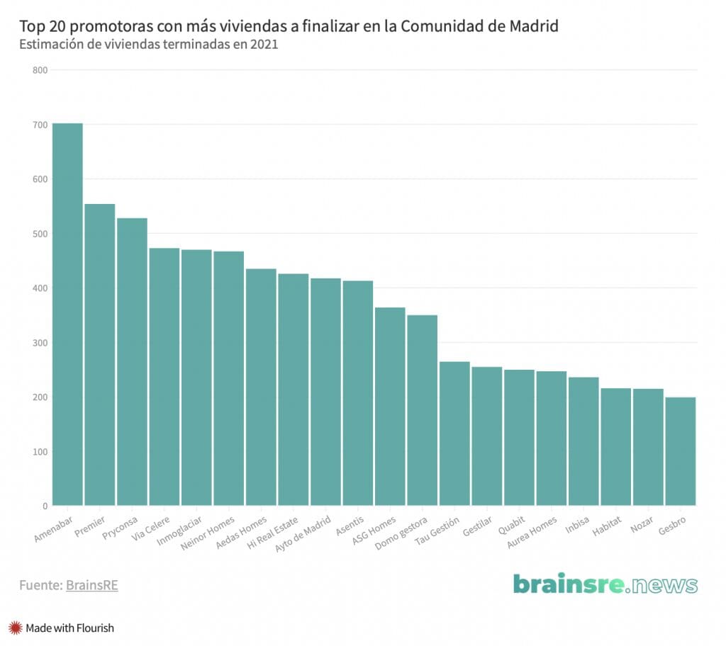 Le promoteur basque Amenabar, avec 701 logements à réaliser et 6 projets, est en tête du classement. Plusieurs de ces promotions sont situées à Valdebebas, un quartier au nord-ouest de la capitale où l’entreprise basque s’est fortement positionnée ces dernières années.