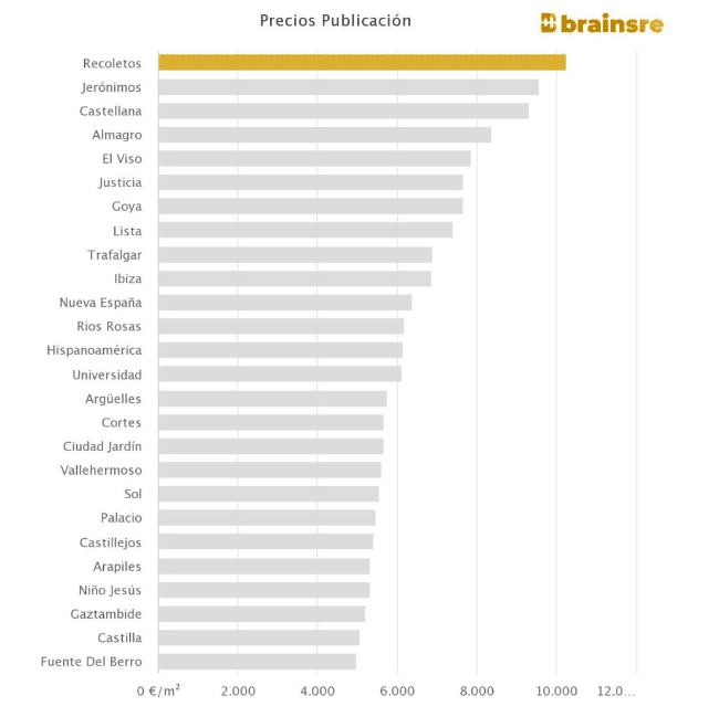 Quel est le prix des logements dans ce quartier luxueux de Madrid ? Dans la Lista, le prix de vente moyen d’un logement s’élève à 7.425 € par m2, un prix qui a considérablement augmenté au cours des deux dernières années. Plus précisément, d’une année sur l’autre, le prix a enregistré une augmentation de 9,9%, selon les données de la plateforme de données immobilières Brainsre.