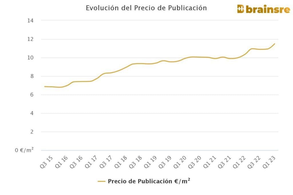Le prix moyen de location d’un bien immobilier en Espagne a clôturé le premier trimestre de l’année à 11,5€ par m2 et par mois, ce qui signifie que le prix n’a jamais été aussi élevé, selon les données de la plateforme de big data immobilière Brainsre.