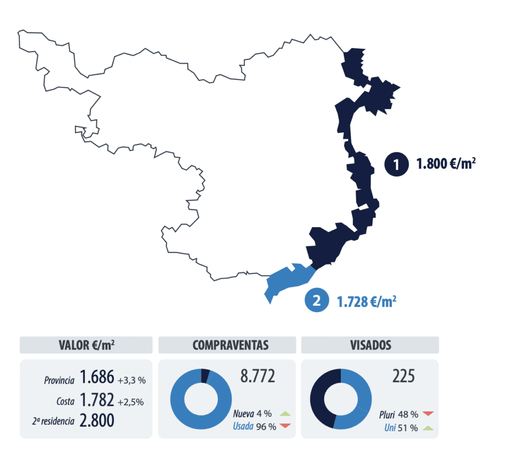 Les ventes et achats ont enregistré une réactivation importante en 2021 et 2022, avec plus de dynamisme et de volume que sur l’ensemble du cycle précédent. L’activité de développement a enregistré une contraction significative en 2022, bien que sur un marché avec des volumes totaux modérés par rapport à d’autres provinces côtières.