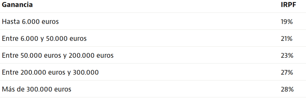 Il est calculé en prenant en compte le prix de vente du logement, le prix d’achat et les frais engagés pour réaliser ces opérations. En fonction des bénéfices obtenus, le montant sera imposé dans les tranches de l’IRPF fixées par le fisc, qui pour 2024 sont les suivantes :