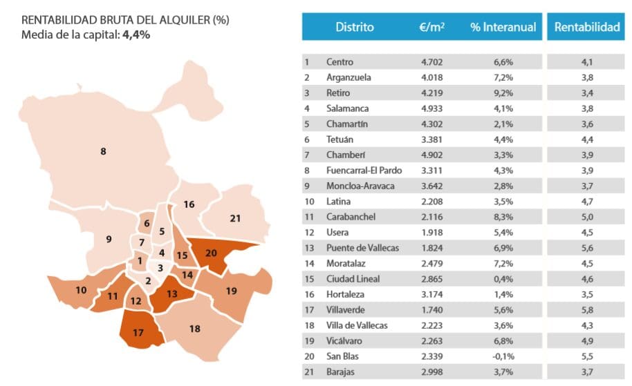 Dans l’ensemble, l’immobilier à Madrid se porte bien, voire très bien, le prix au m2 dans la capitale ayant augmenté de plus de 6% en 2019, tandis que la rentabilité locative se situe entre 4 et 5,5% selon les quartiers.