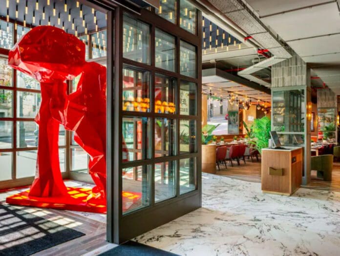Le Radisson RED Madrid est installé dans un bâtiment industriel historique utilisé comme scierie au XIXe siècle avant de devenir un hôtel 100 ans plus tard. Désormais, à leur arrivée, les clients sont accueillis par une sculpture rouge d’un ours et d’un arbre, qui occupe le devant de la scène à l’entrée de l’hôtel. La sculpture s’inspire du monument original de l’ours et de l’arbousier de la ville situé sur la Plaza de la Puerta del Sol et représente les symboles de Madrid.
