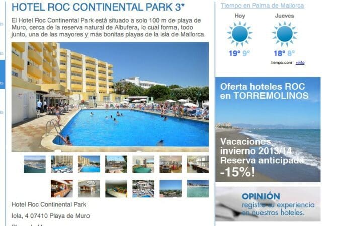 Objectif quasi rempli : La chaîne Roc Hotels vient d’ajouter une nouvelle propriété à son portefeuille et a presque atteint son but, fixé l’année dernière, d’atteindre les 20 hôtels pour 2015 . La chaîne d’hôtel de Majorque dispose actuellement de 19 établissements depuis la fin de semaine dernière avec l’ajout d’un hôtel à Playa de Muro (Mallorca ) . Le nom : Roc Continental Park, un superbe palace situé à 100m de la plage , trois étoiles, composé de 156 chambres et 30 studios et appartements . Un prochain aux Caraïbes ? À l’heure actuelle Roc Hôtels est en négociation pour intégrer de nouveaux établissements en Espagne et dans les Caraïbes , où il dispose d’une équipe de direction composée d’un directeur général , un directeur financier , un comptable , six commerciaux et trois responsables de l’hôtel . Parmi ceux-ci , selon la chaîne, dans un communiqué envoyé à preferente.com , les directeurs généraux des parties Espagne et Caraïbes, sont en ce moment en train de sonder et interroger les candidats à une vente.