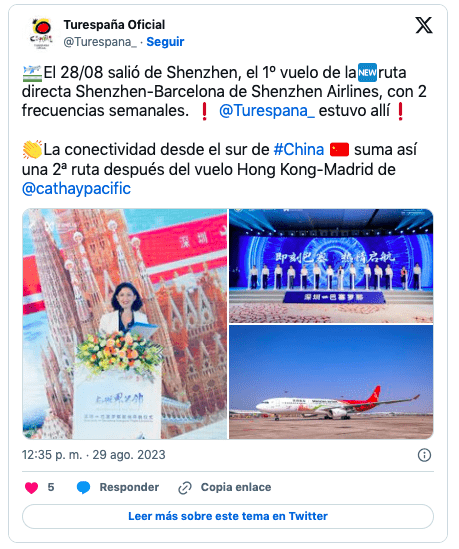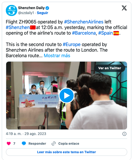 Le vol Shenzhen-Barcelone est le deuxième vol direct de Shenzhen Airlines au départ de l’Europe, la compagnie assurant également la liaison Londres-Shenzhen.