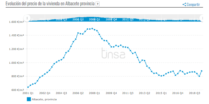 Si nous analysons l’évolution du prix comme s’il s’agissait d’un indice dont le point de départ est l’année 2001 (base 1.000 points), nous constatons que la valeur moyenne du logement au deuxième trimestre de 2019 s’est établie à 1.306 points dans la province d’Albacete.