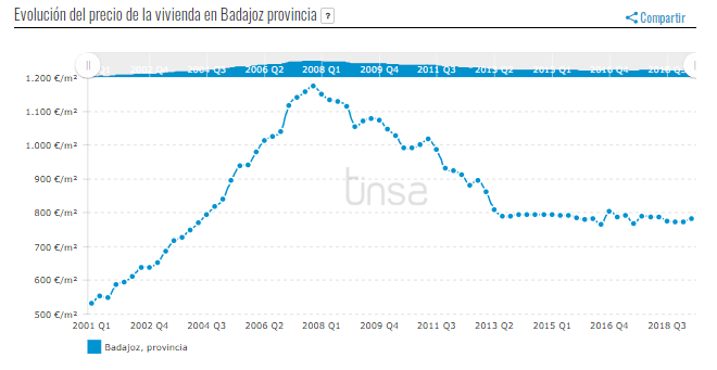 Pour analyser le niveau actuel des prix du logement par rapport à 2001, Tinsa a généré un indice basé sur 1.000 points en 2001. En ce qui concerne cette référence, le prix du logement dans la province de Badajoz pour le deuxième trimestre de 2019 s’élève à 1.409 points.