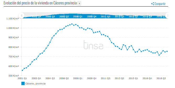 Le prix du logement dans la province de Cáceres a enregistré une croissance annuelle de 5,6%, atteignant 754 euros / m². Des valeurs maximales atteintes en 2007, la valeur des appartements dans la région s’est dépréciée de 27,5%. Le marché résidentiel a évolué de manière négative par rapport à ce que nous avions en 2019. Au deuxième trimestre de 2019, le prix était de 0,8%, un chiffre inférieur à celui enregistré l’an passé sur la même période.