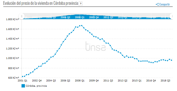 Le prix moyen du logement dans la province de Córdoba au deuxième trimestre de 2019 s’élevait à 959 € / m², ce qui représente une baisse de 1% par rapport à l’année précédente. Jusqu’à présent cette année, le logement a été réévalué de 1% dans la province par rapport à la fin de l’année précédente. En 2018, les données accumulées à cette période de l’année reflétaient une augmentation de 2,2%.