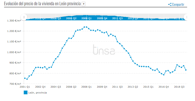 Le prix des logements dans la province de León a atteint un sommet historique au premier trimestre de 2008. Depuis lors, le prix a subi un ajustement cumulé de 32,8%.