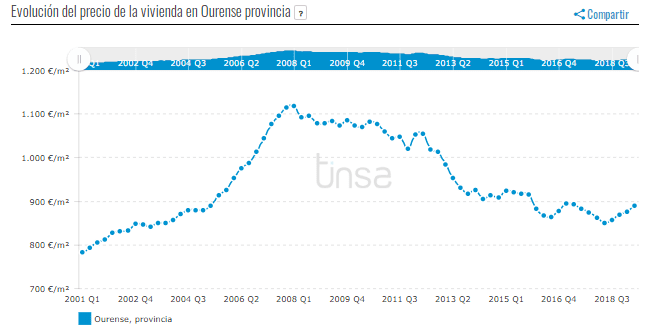 Le prix du logement dans la province d’Ourense a connu une croissance annuelle de 4,5% au deuxième trimestre 2019, jusqu’à 888 euros / m². Par rapport aux valeurs maximales atteintes en 2008, la valeur des appartements dans la région s’est dépréciée de 20,5%. Le marché résidentiel a évolué de façon positive par rapport à 2019. Le prix au deuxième trimestre de 2019 est de 2,2%, un chiffre supérieur à celui enregistré l’année dernière sur la même période.