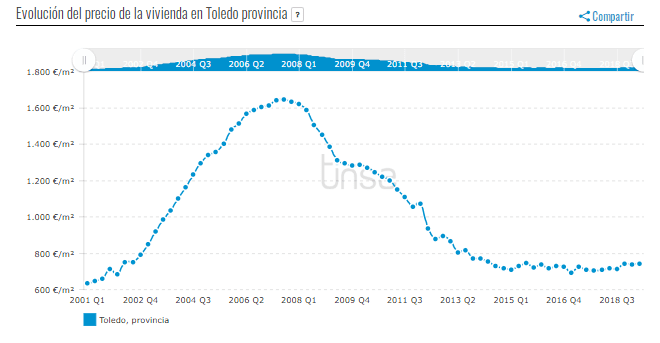 Le prix des logements dans la province de Tolède a atteint un sommet historique au troisième trimestre de 2007. Depuis lors, le prix a subi un ajustement cumulé de 54,8%.