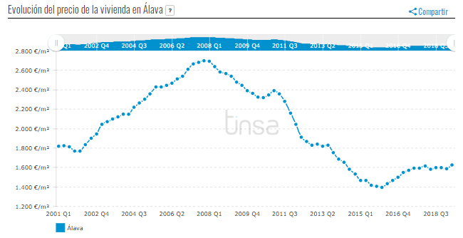 Le prix des logements dans la province d’Álava ont atteint leur plus haut niveau historique au quatrième trimestre de 2007. Depuis lors, le prix a subi un ajustement cumulé de 39,8%.