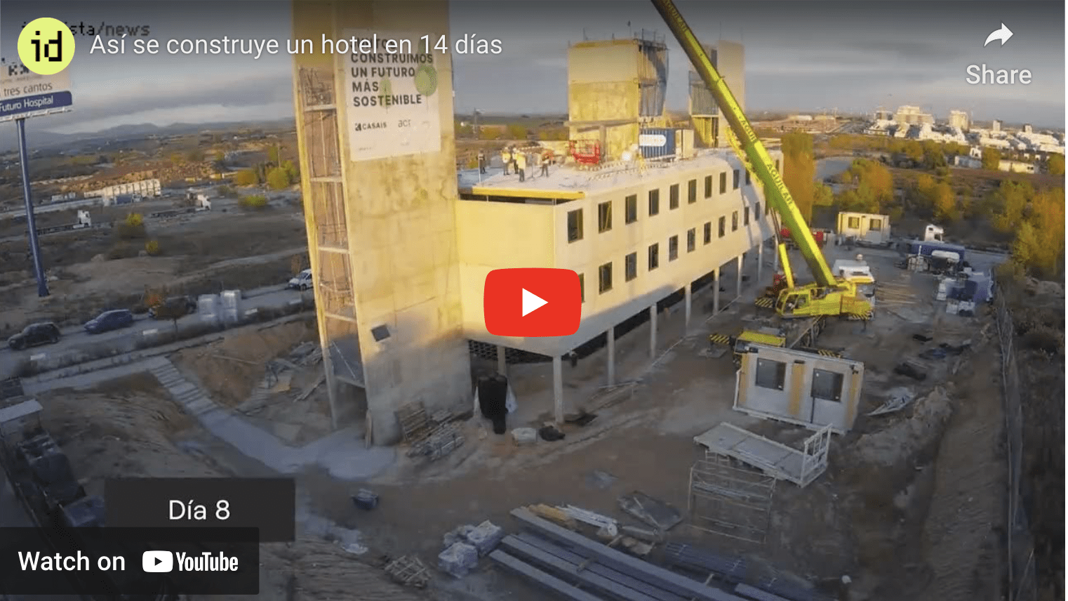 L’entreprise de construction Casais España IC, appartenant au groupe Casais d’origine portugaise, et l’entreprise de construction espagnole ACR, ont terminé en 14 jours le montage de la structure industrialisée de l’hôtel B&B qu’elles sont en train de développer à Tres Cantos (Madrid). Le bâtiment, promu par Sunny Casais et conçu par TdB Estudio de Arquitectura, compte 5 étages et est le 1er bâtiment construit en Espagne avec le système hybride industrialisé développé par CREE Buildings, dans lequel le bois joue un rôle prépondérant, ont annoncé aujourd’hui les 2 entreprises.