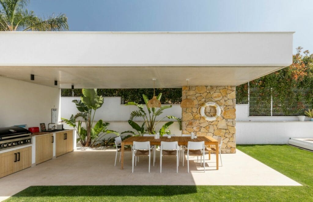 Le rez-de-chaussée abrite la zone de jour, qui comprend une cuisine ouverte sur le salon-salle à manger et un accès direct au jardin et à la piscine par le biais d’un grand porche. Sur ce même étage, séparé par un patio de lumières, se trouve une chambre principale avec dressing, salle de bains et accès à un patio intérieur avec douche extérieure, à l’abri des regards du voisinage.