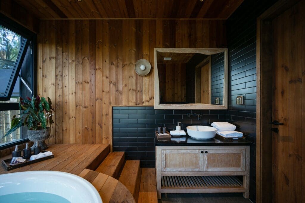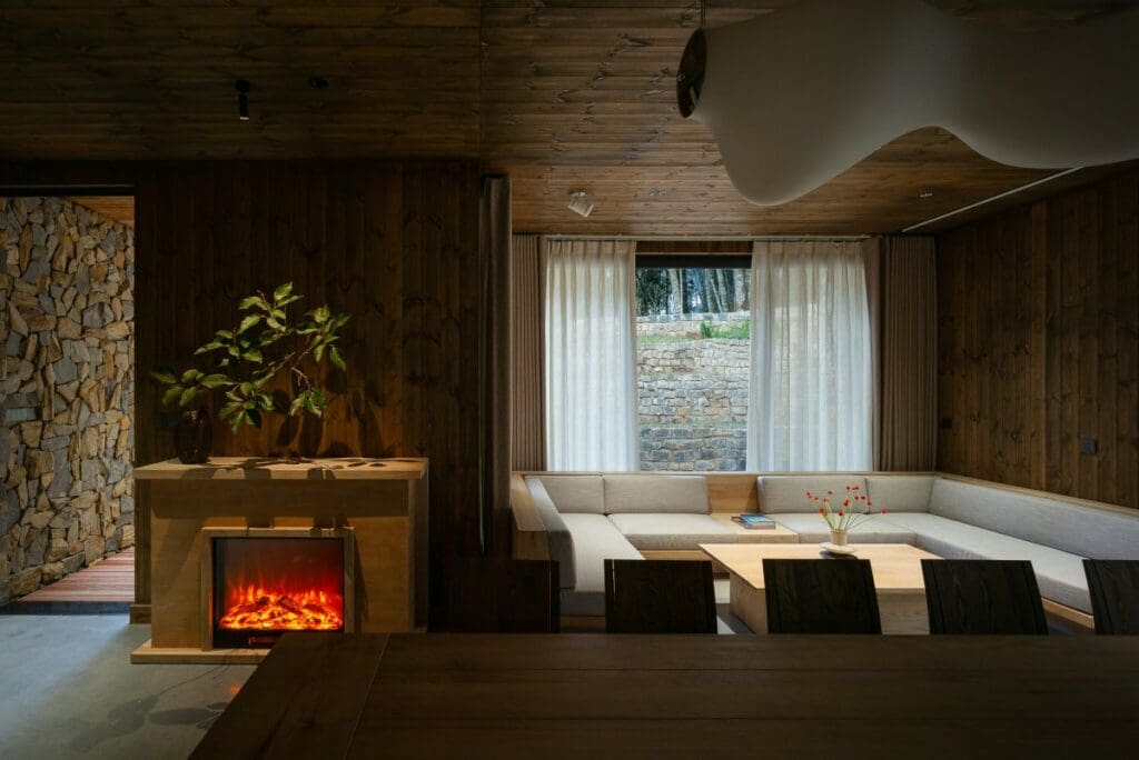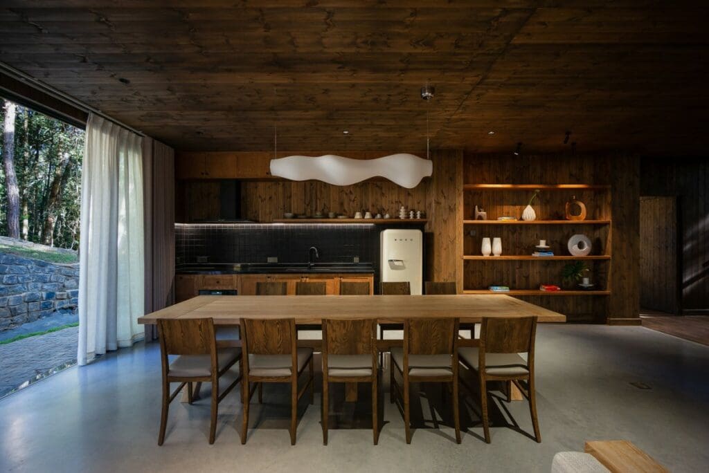 Le matériau choisi par l’équipe de conception pour la maison est le bois de pin modifié, apprécié pour sa résistance à l’humidité, aux moisissures, aux termites, à la chaleur, à la stabilité, à la durabilité et au respect de l’environnement. Ce qui rend le bâtiment encore plus intéressant, c’est que le bois naturel utilisé pour le construire diffère en couleur. Les tons de bois vont du clair au foncé et ont été utilisés dans différentes parties de la maison. Les immenses baies vitrées offrent des vues surréalistes sur le paysage forestier environnant et laissent entrer de grandes quantités de lumière naturelle pendant la journée.