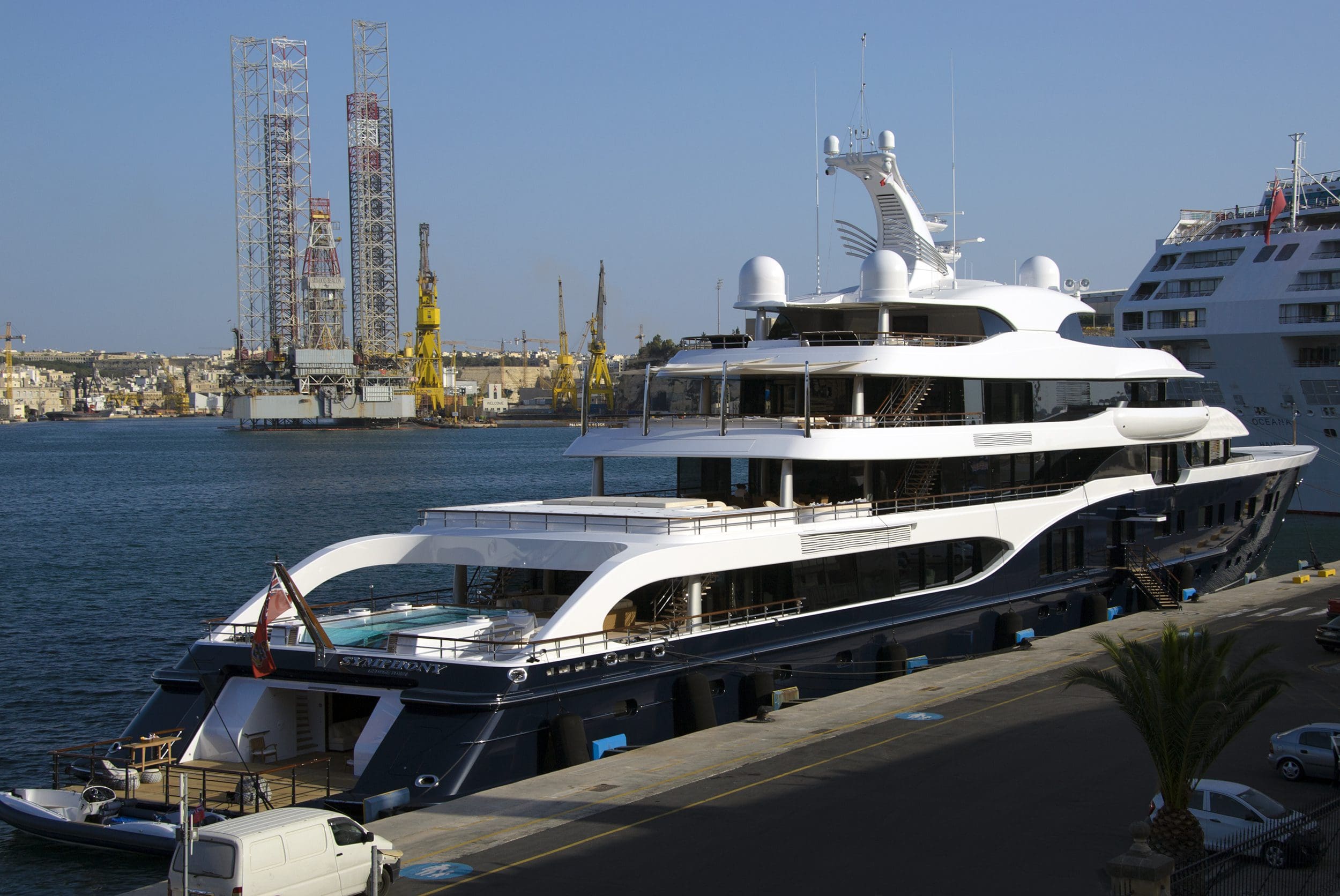 Oeuvre de la compagnie hollandaise Feadship, « Le Symphony » est un impressionnant yacht de 101,5 mètres de long pouvant accueillir jusqu’à 16 passagers. Il est notamment équipé d’un jacuzzi sur le pont, d’une piscine, d’un bar extérieur, d’un cinéma, d’un spa et d’un sauna, d’une bibliothèque ou encore d’un gymnase.