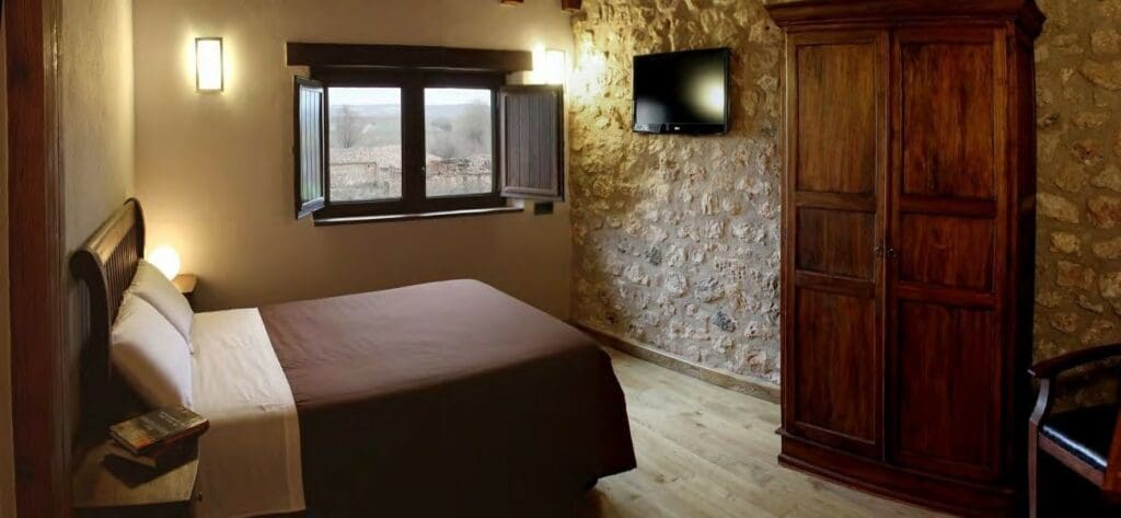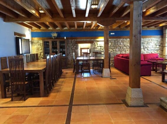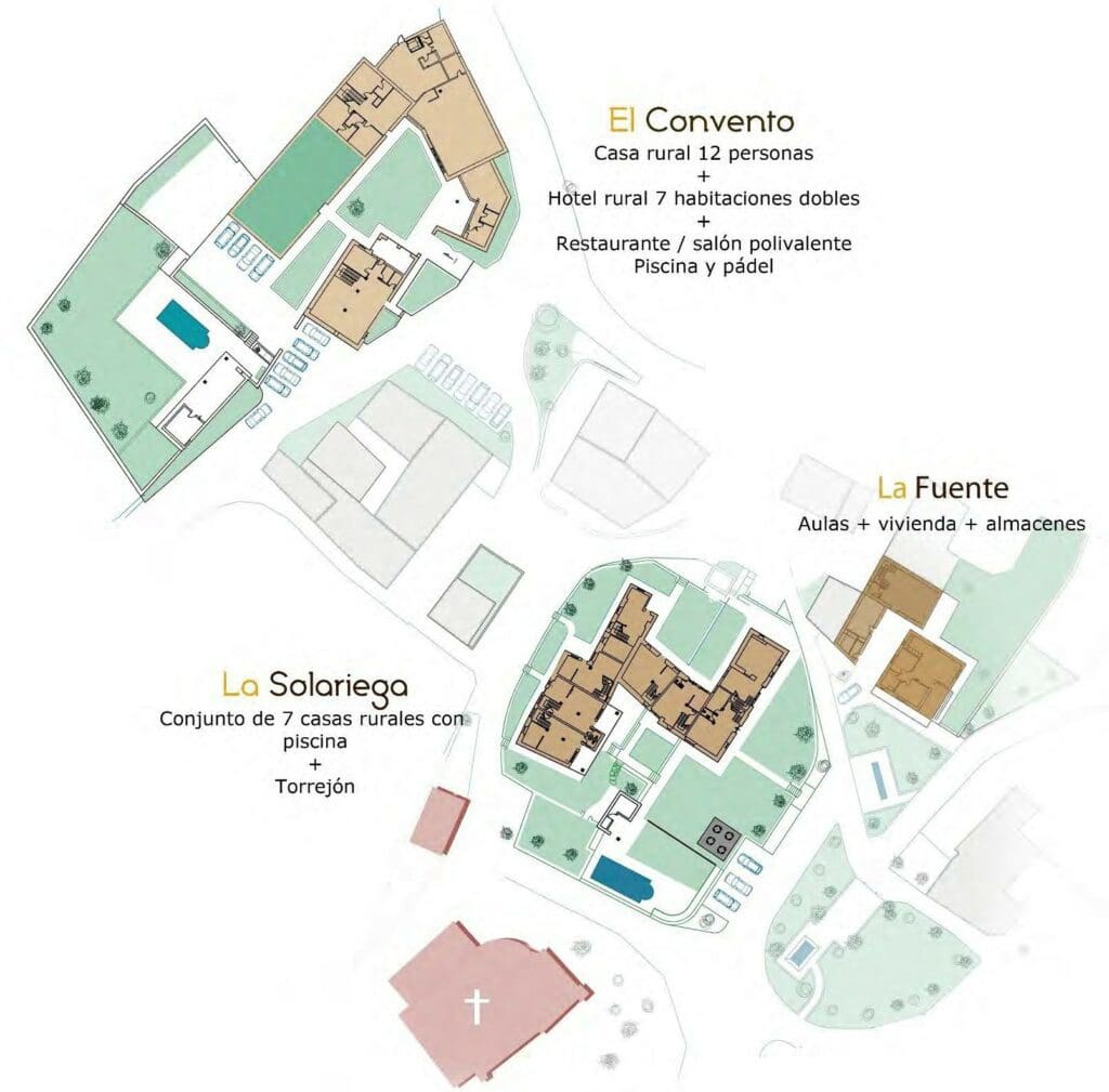Le complexe est composé de sept maisons rurales pour 4/6 personnes chacune, une autre maison rurale pour 12 personnes, un hôtel avec 7 chambres doubles, un restaurant, avec une cuisine pouvant accueillir jusqu’à 90 convives, une tour à usage commun pour tous les locataires, deux piscines, un court de paddle, l’utilisation et la gestion d’une église romane, une autre maison, des salles de classe, des entrepôts… au total, plus de 2.600 m² construits en pierre de taille, en acier Corten et en bois dur.