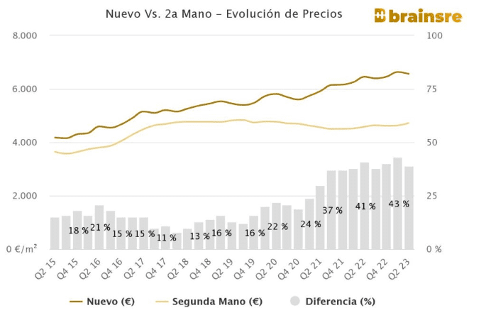 Si l’on analyse séparément le prix des logements neufs et celui des logements d’occasion à Barcelone, on constate que le prix de ces derniers est resté plus stable au cours des dernières années, tandis que le prix des logements neufs a augmenté plus fortement. Actuellement, la différence entre les deux prix est de 39%, ce qui est très proche de la moyenne espagnole de 40% et beaucoup plus élevé qu’à Madrid, où elle est de 13%.
